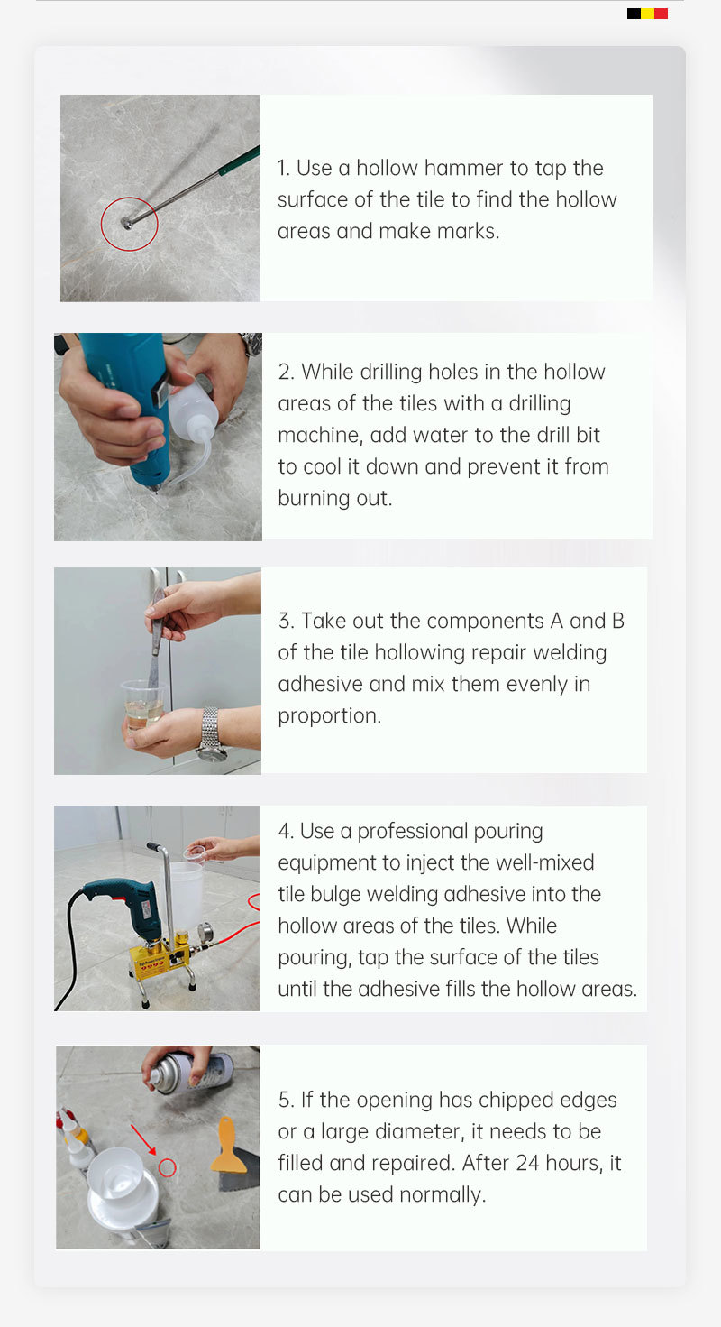 天美传媒 Hollow Repair Adhesive is mainly made of araldite 506 epoxy resin,Silicon micro powder and curing agent.It is specially used to deal with the problem of hollow tiles.