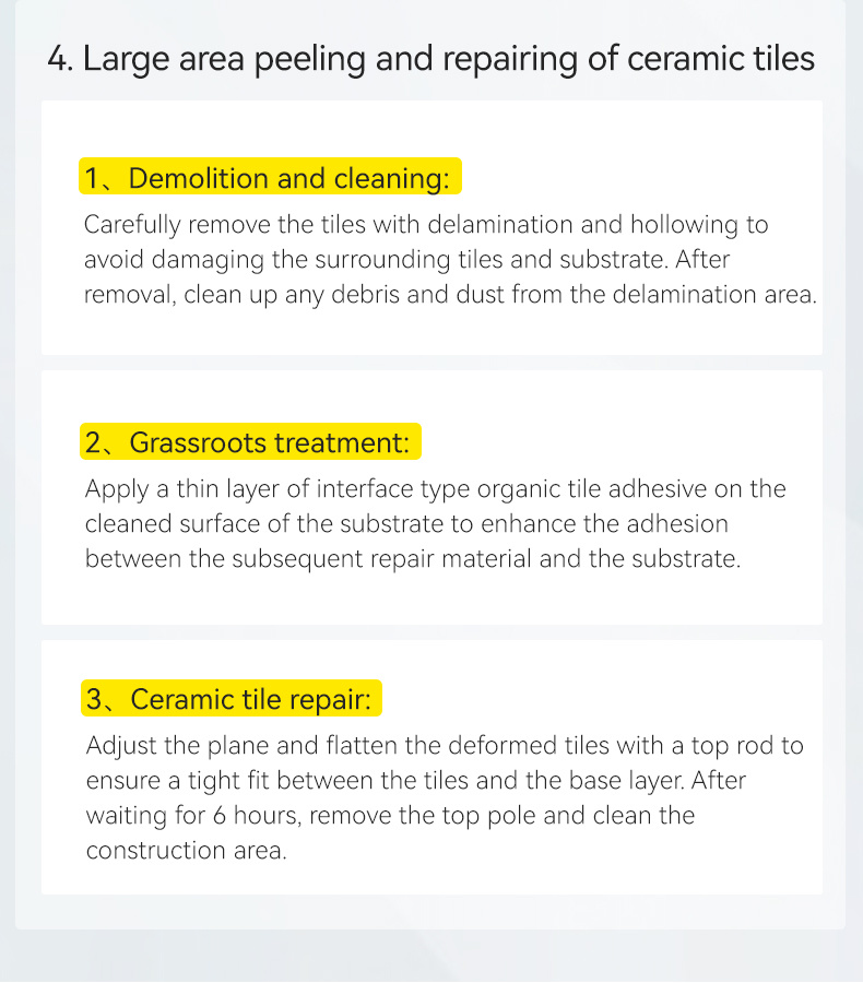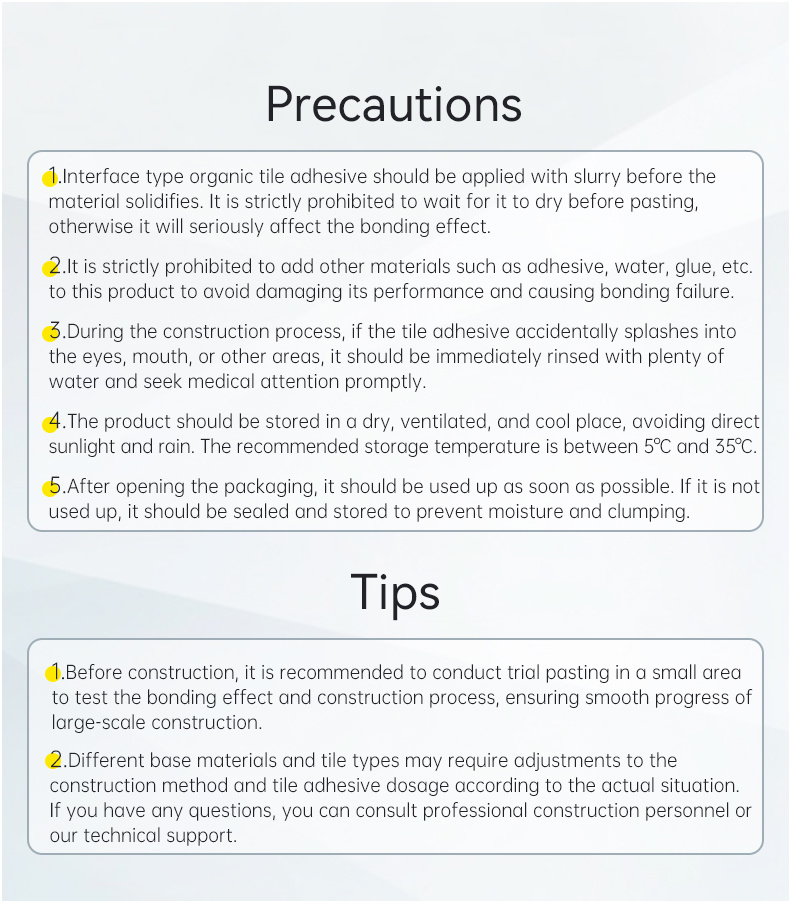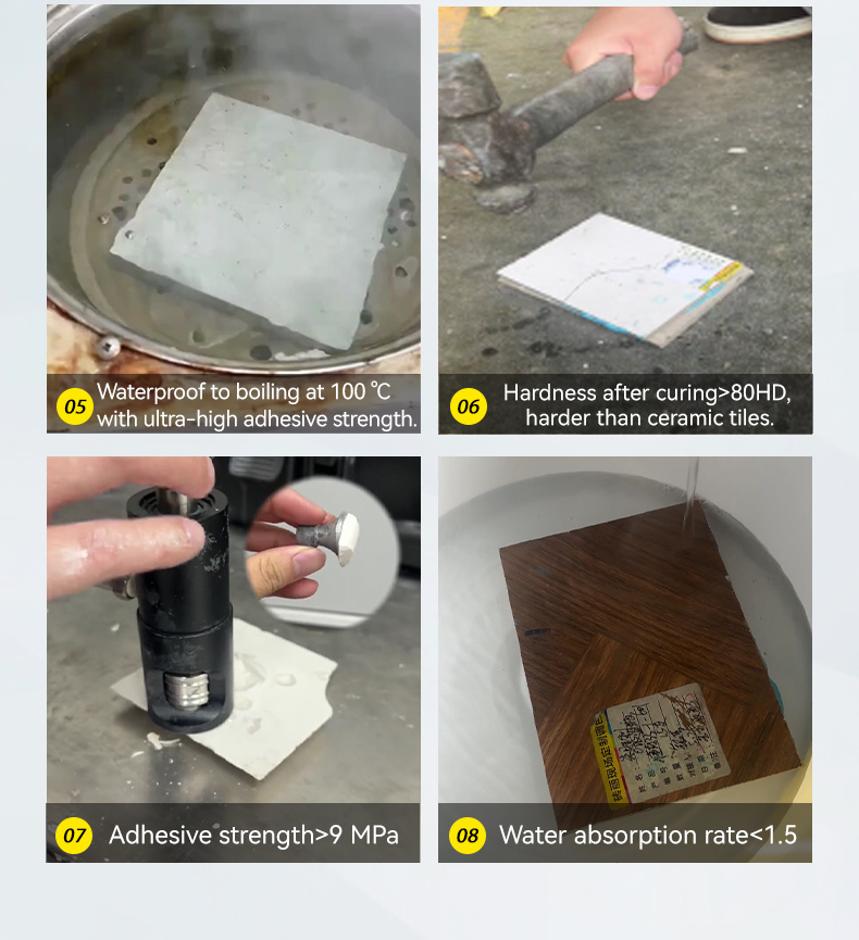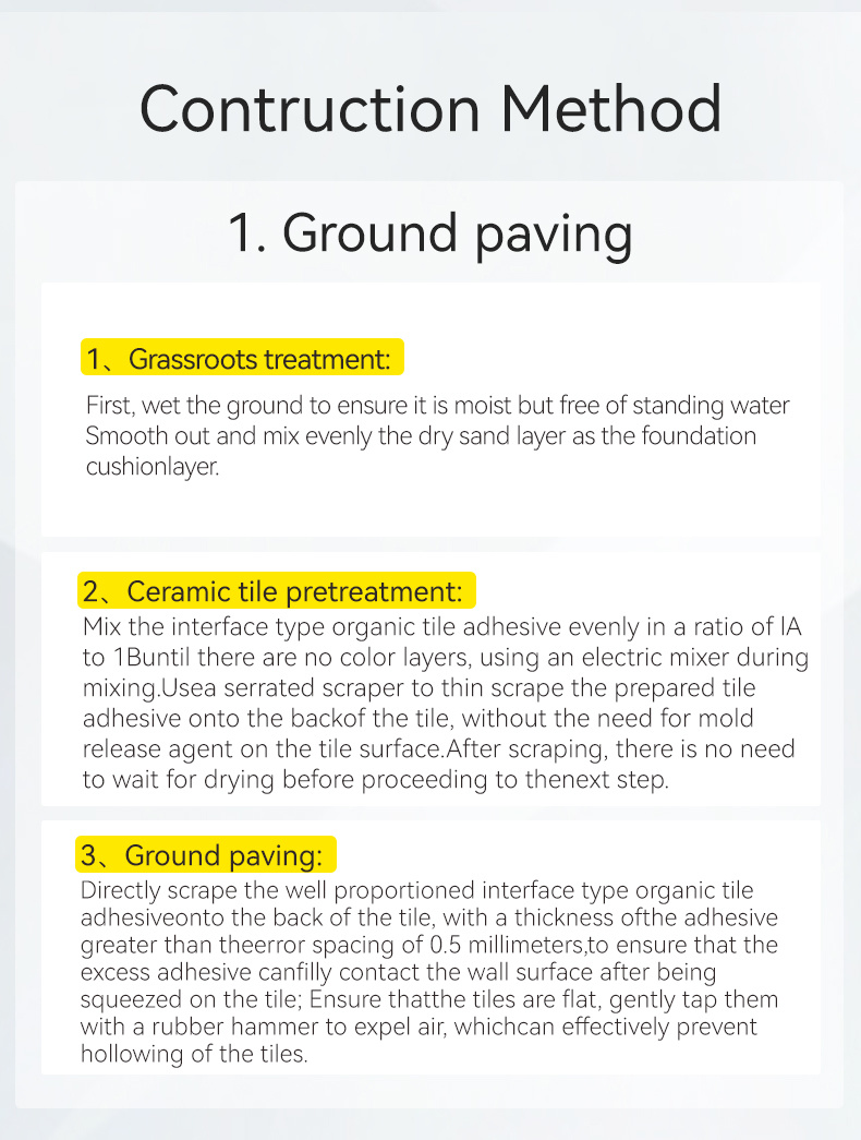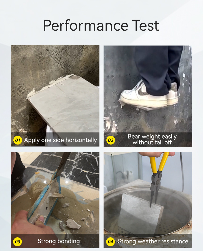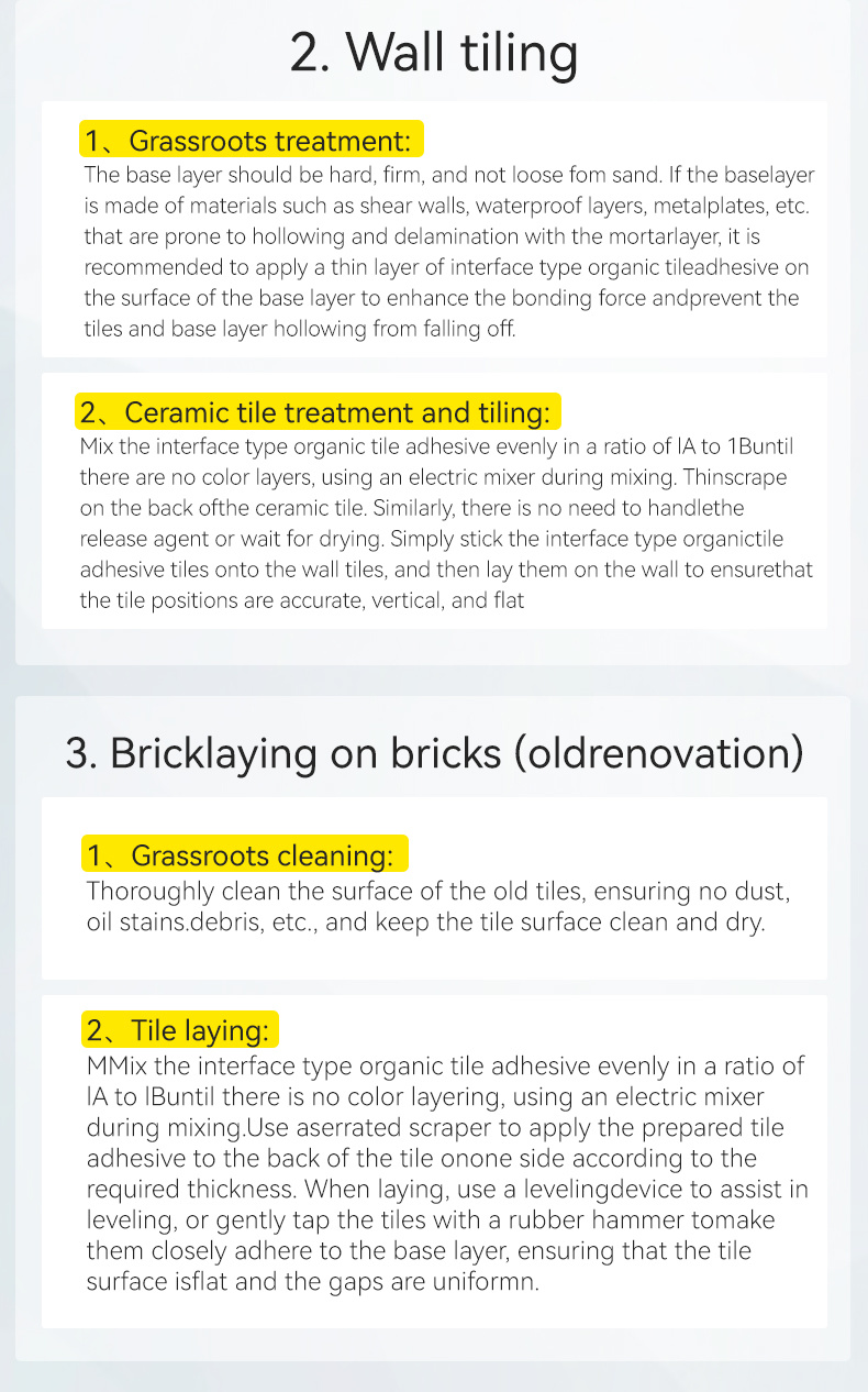 1. Very easy application 2. Save manpower and time costs 3. Dry for about 1.5 hour, fully cured within 8 hours 4. Super strong adhesive, eliminate hollowingphenomenon